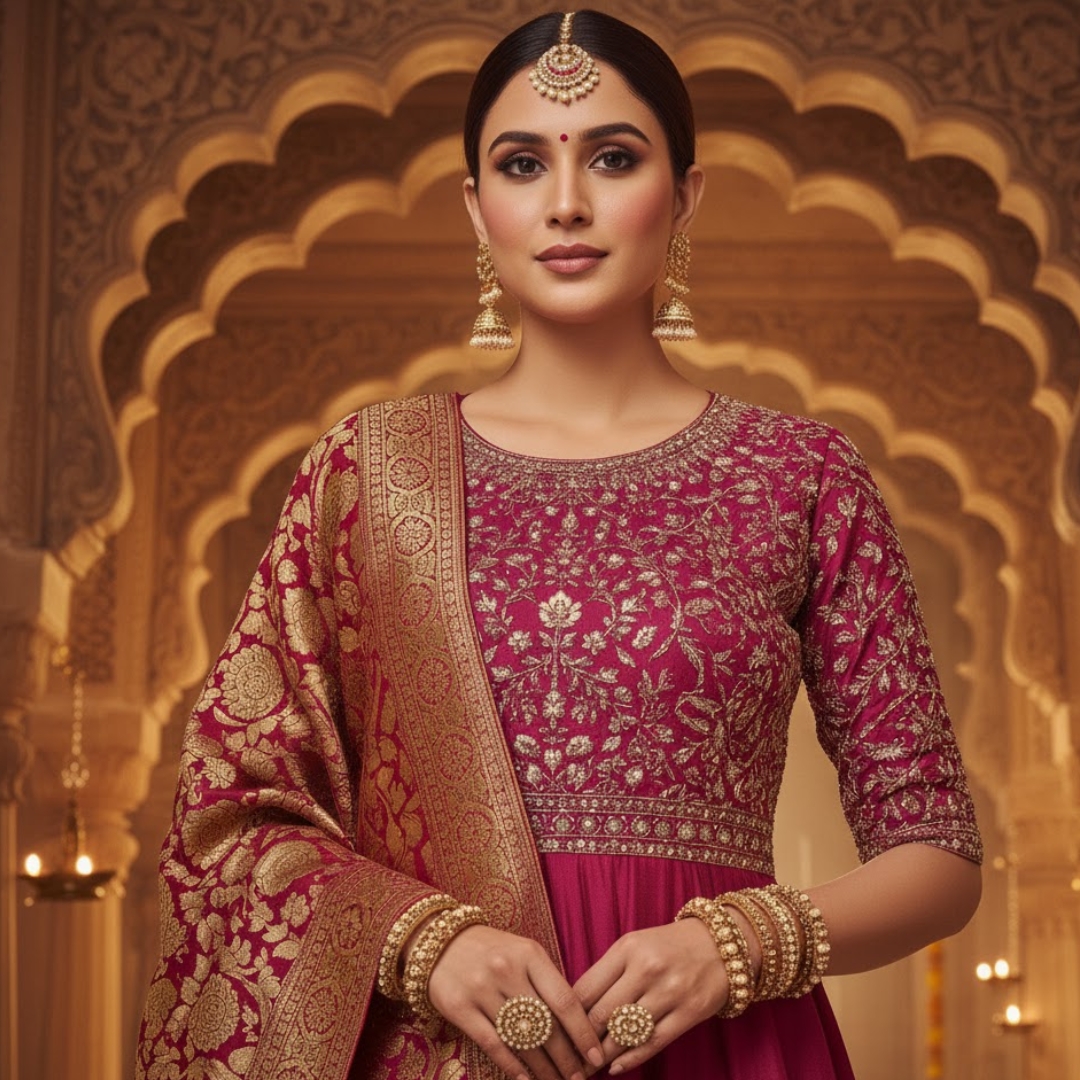 Elevate your ethnic wardrobe with our Magenta Silk Anarkali with Banarasi Dupatta, a timeless blend of luxury and tradition. The Anarkali is crafted from premium-quality silk, offering a natural sheen, graceful fall, and regal charm. Its rich magenta hue enhances the outfit’s sophistication, making it an ideal choice for festive gatherings, wedding functions, and celebratory events.