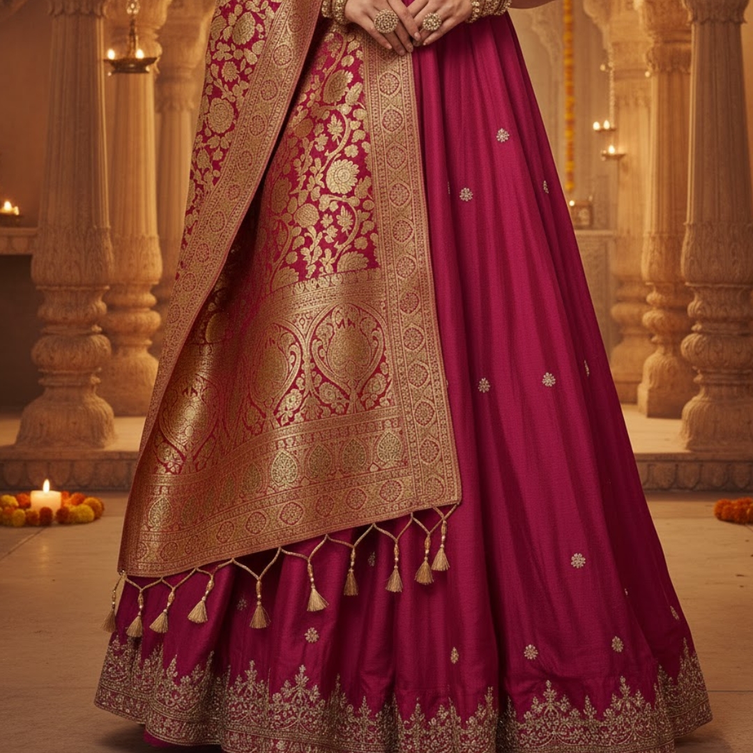 The ensemble is beautifully complemented with a heavy Banarasi brocade dupatta, intricately woven with traditional motifs that reflect India’s centuries-old weaving heritage. The dupatta adds a striking contrast and opulent finish, making every step feel grand and picture-worthy.